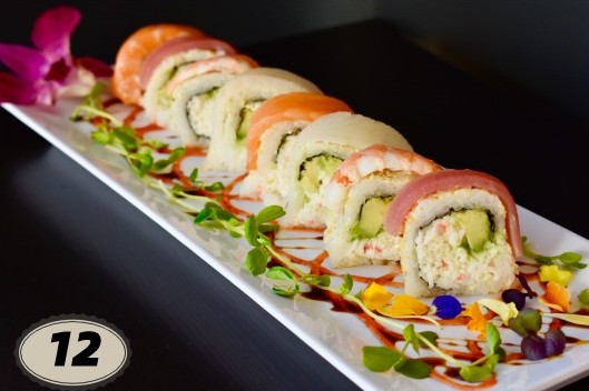 Roll: California Roll Outside: Salmon, Tuna, Shrimp, Yellowtail