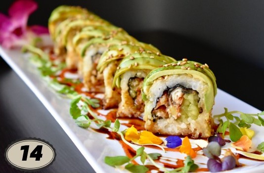 Roll: Fresh Water Eel, Cucumber Outside: Avocado, Sesame Seed Sauce: Eel Sauce