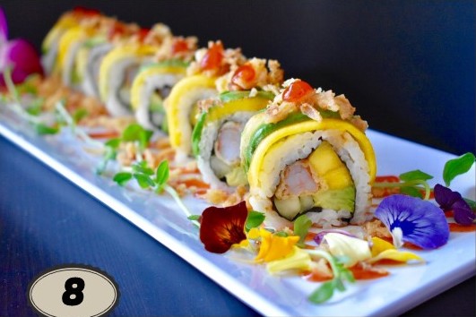 Roll: California Roll Outside: Mango, Avocado, Crunchy Onion Sauce: Eel Sauce, Spicy Mayo