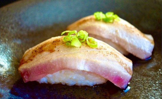 Top: Seared Tuna, Green Onion Bottom: White Rice Sauce: Ponzu Sauce