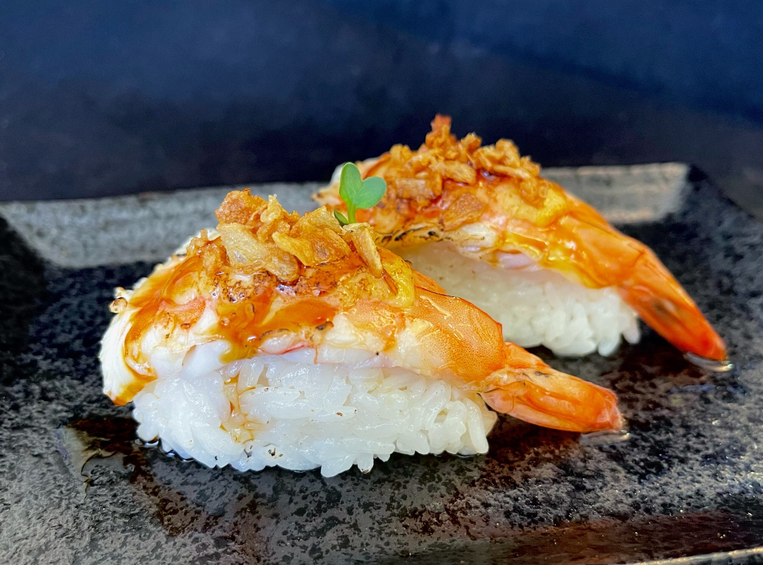 Top: Seared Ebi Shrimp, Spicy Mayo, Crunchy Onion Sauce: Eel Sauce